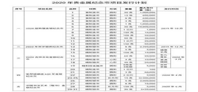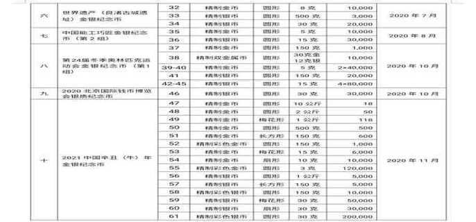 中国人民银行2020年贵金属纪念币项目发行计划共包括10个项目,61个品种。这10个项目是:2020版熊猫金银纪念币、2020年贺岁银质纪念币、2020吉祥文化金银纪念币、紫禁城建成600年金银纪念币、中国书法艺术(楷书)金银纪念币、世界遗产(良渚古城遗址)金银纪念币、中国能工巧匠金银纪念币(第2组)、第24届冬季奥林匹克运动会金银纪念币(第1组)、2020北京国际钱币博览会银质纪念币、2021中国辛丑(牛)年金银纪念币。