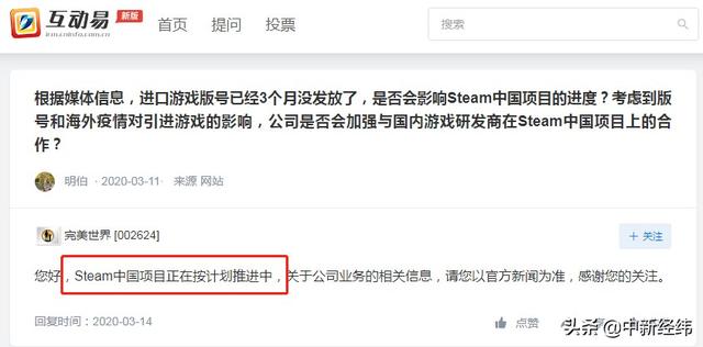 中新经纬客户端查询深交所互动易发现,2020年3月有投资者提问完美世界:根据媒体信息,进口游戏版号已经3个月没发放了,是否会影响Steam中国项目的进度?考虑到版号和海外疫情对引进游戏的影响,公司是否会加强与国内游戏研发商在Steam中国项目上的合作?完美世界回应称,Steam中国项目正在按计划推进中。