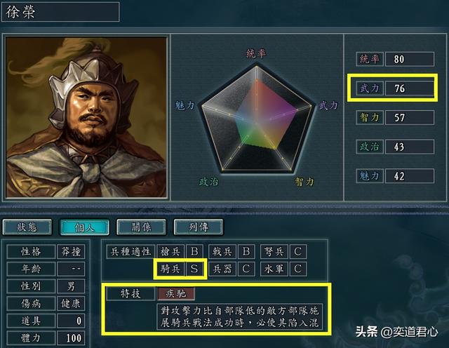 汴水之战败曹操,梁东之战破孙坚,汉末三巨头的其中两位都被徐荣狠狠锤过,如此出色的骑兵将领竟然被长驱给打发了。掌握虚实特技的曹操和驱逐特技的孙坚都堪称三国志11里的T0级角色,不发一个疾驰给徐荣,未免太失真了吧。