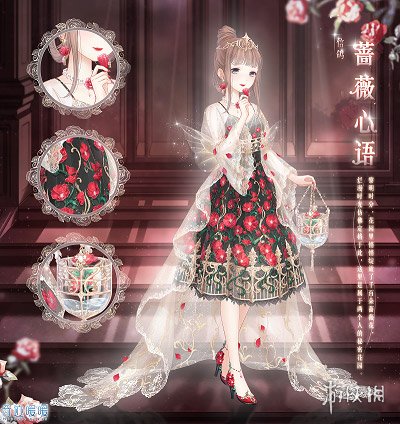 【蔷薇心语】含正常姿势与特殊姿势,特殊姿势外套“蔷薇心语”,海报展示妆容为“玫瑰情浓”。