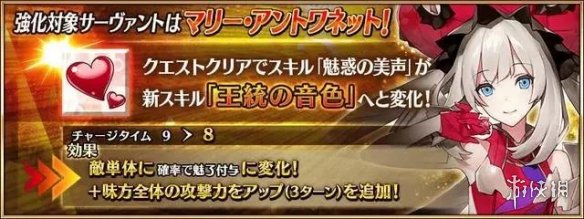 强化简评:玛丽除了将原本仅限异性的魅惑改成不限性别,以及降低了冷却时间外,还附加了一个类似领导力的全队3回合加攻效果。可以说一定程度上弥补了其虽然生存能力绝佳但宝具0伤害加成的缺点。且作为生存向从者也终于对全队有了一些输出辅助能力。