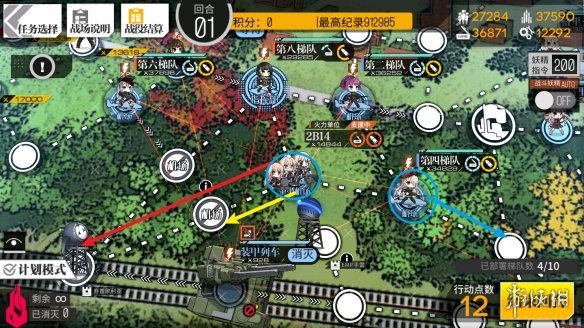 1.依次部署三个重装,按照红色和黄色线走动到黑雷位置,右侧的负责右上的四队走下一格部署路障队,消耗七个行动点。
