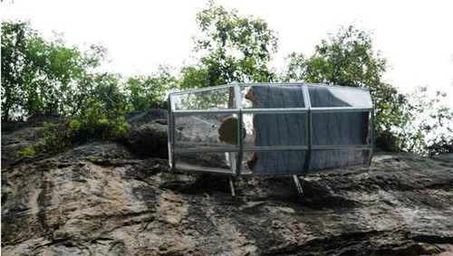 湖南张家界宝峰湖边的一面崖壁之上,近日搭建了一家以“土家”为主题的玻璃制房间,游客将来可以“攀岩走壁”进入玻璃房,白天可俯览宝峰湖美景,晚上则可躺在床上细数漫天繁星,无比惬意。