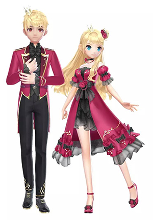暗红色的燕尾服搭配黑色西装裤,华丽高雅。一字肩的缎面短裙搭配黑纱,玫瑰腰带增添一份神秘。