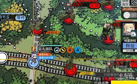 在开局时即有八个友方梯队(包括ar小队和404小队),在结算时存活的友方梯队会提供分数。需要注意的是,最上方的汤哥在第一回合打不过绿无敌,必须要优先保护,而下方较远的两队可以轻松吃下开局的军方。