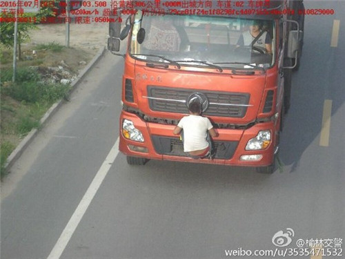 有网友传图片爆料,在榆林一名男子为了躲避车辆被电子眼拍照,竟在经过监视器前的路段时,手脚并用爬上大货车车头,攀在车牌号码前,这一幕不仅让网友看了相当傻眼,还封他为“用生命挡车牌的真男人”。