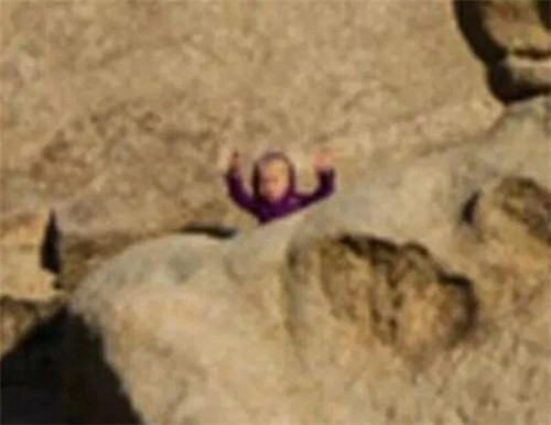 让我们把疑似巨石接缝的地方放大来看,这个红圈里就是小萝莉,再放大一些,小萝莉正挥着双手,紫色的外套在放大图片里非常醒目,然而在原图里完全和黑压压的缝隙融为一体。