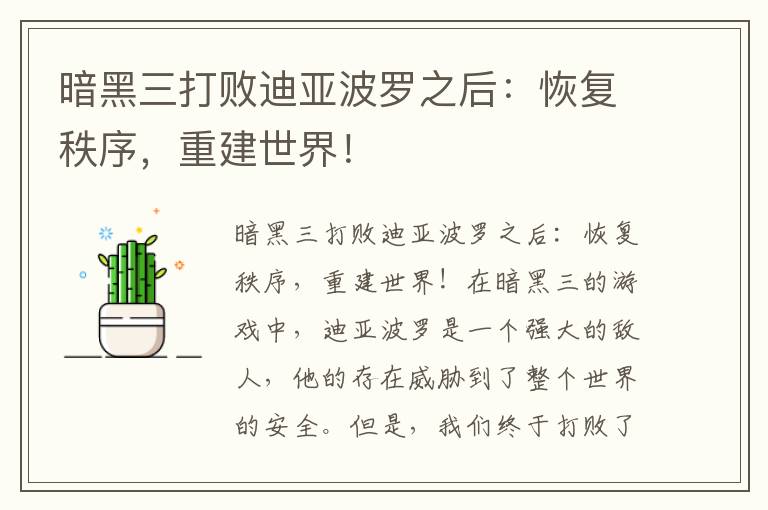 打败迪亚波罗之后,我们需要重建这个世界,恢复秩序。通过收集资源、建造房屋和道路,以及建立法律和秩序,我们可以在这个世界中生存和繁荣。我们还需要提供基本服务,以确保人民的基本需求得到满足。让我们一起努力,建立一个更美好的世界!
