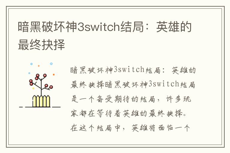 暗黑破坏神3switch结局是一个充满深意和哲理的结局,它将带给玩家一个难以忘怀的体验。让我们一起期待着这个结局的到来,去探索和抉择英雄的最终命运。
