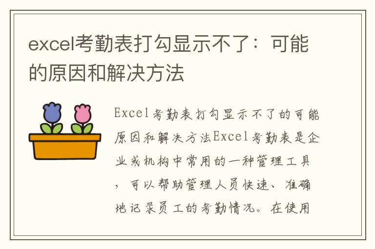 Excel考勤表是企业或机构中常用的一种管理工具,可以帮助管理人员快速、准确地记录员工的考勤情况。在使用Excel考勤表的过程中,有时会遇到打勾显示不了的问题,这个问题可能会给管理人员带来一定的困扰。本文将介绍Excel考勤表打勾显示不了的可能原因和解决方法,希望对大家有所帮助。