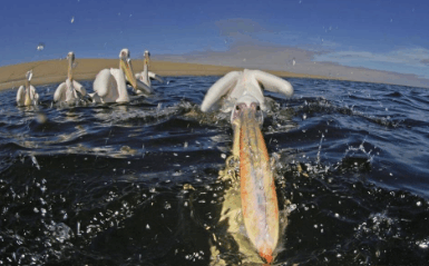 在纳米比亚沃尔维斯湾的附近海域,一只白鹈鹕在抢食鱼杂碎。这种鸟经常聚集在港口和渔船附近。