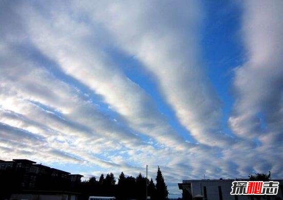 这种云很像飞机飞过之后留下的痕迹,所以又有人叫做飞机云。一般预示着2周后会有地震;成平行或者放射状的云又称“排骨云”,现观测多为本地地震;而现有观点认为放射状云的震中是其成弧指向的圆心。