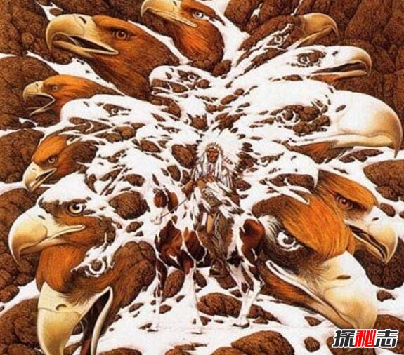 46、你看到很多鹰的头像,你又能看到中间骑马的印第安人吗?