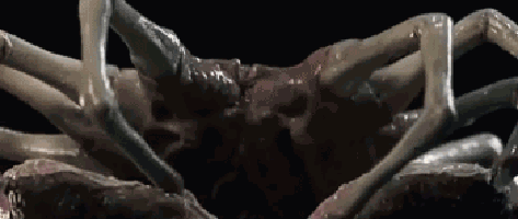 虫生阶段就是异形的幼虫期,长着八根手指一样的腿,可以快速爬行。当有哺乳动物靠近时,它能精准地跳到你的脸上,给你来一个漫长的法式深吻,此时抱脸虫会用爪子紧紧抱住宿主的脸,然后用尾巴缠住脖子,确保对方会因为窒息而张大嘴巴。然后,它会把注射器深入你的喉咙,并将异形胚胎直接注入对方体内。骑脸+口爆+深喉,黄暴指数再次升级。