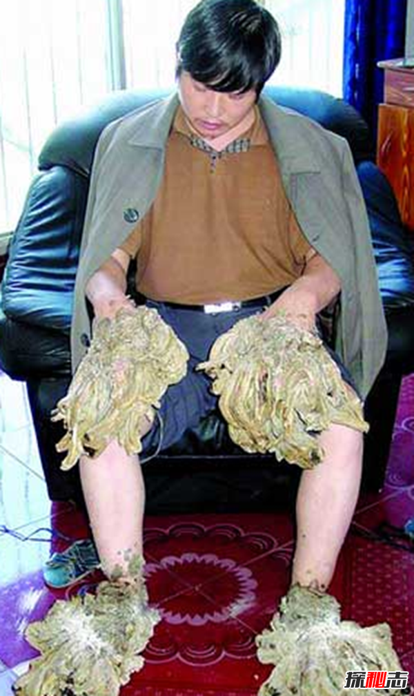 墩布手是一种怪病,将手脚完全覆盖,是手脚长“瘊子”并生出许多角质“枝条”就像套上了4团墩布。