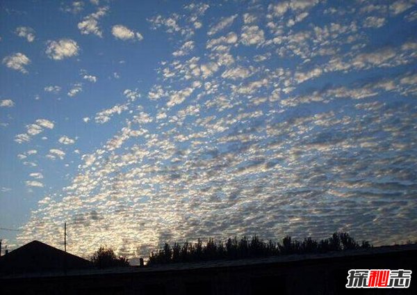 这种云密集恐惧症的人估计不能看,大云都分成了很多鱼鳞状的云团,看起来密密麻麻的很恐怖。有人还认为这种云比较浅的一端会是地震中心,2-6天之后可能发生地震。