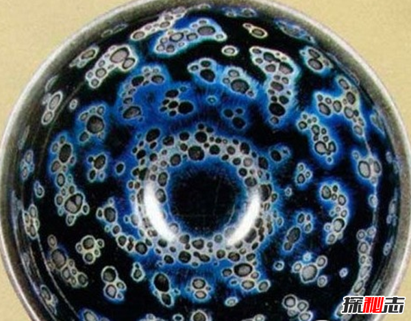 这个茶碗是南宋人用来斗茶的,是一个很值得珍藏的宝物,因为在考古学家发现的大量瓷片中都没有发现跟这个茶碗瓷片一样的质地,这种茶碗据说是有两只,在黑暗中转动茶碗底座,会随着光线角度的不同,茶碗展现的光环颜色也不尽相同,之后被流传到了日本后,十分受王公贵族争相追捧,其中的一只茶碗被织田信长所得到,后被毁掉,另一只茶碗是德川家康传下来的秘宝,现被收藏于东京静嘉堂文库。