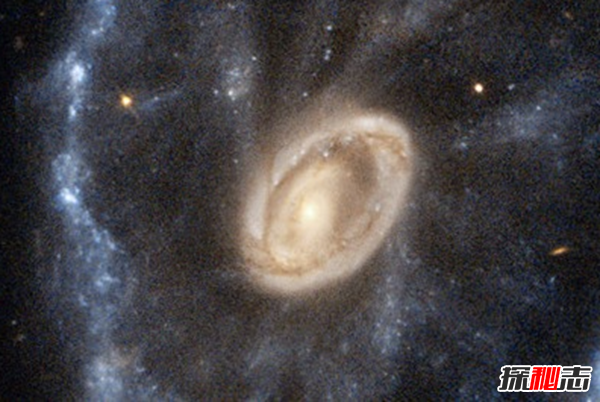 随着左边的两个星系,它们是一组星系约4亿光年,在玉夫座的一部分。大星系的边缘跨度超过100000光年,是由恒星形成区域充满了极其明亮和巨大的恒星。图为,车轮的环形引力破坏的一个较小的星系通过一个大的一个造成的结果,压缩星际气体和尘埃,导致恒星形成的波移动就像在池塘水面的涟漪。