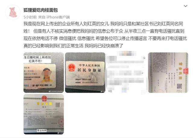 极目新闻记者注意到,该网友发布的照片除了她母亲刘红英的身份证之外,还有该公司的营业执照。8日下午,记者联系上刘红英的丈夫靳先生,他介绍,现在给妻子打电话的人确实太多了,已经没办法正常生活,他们已经报警处理。靳先生还表示,网友“狐狸爱吃肉桂面包”正是他女儿。