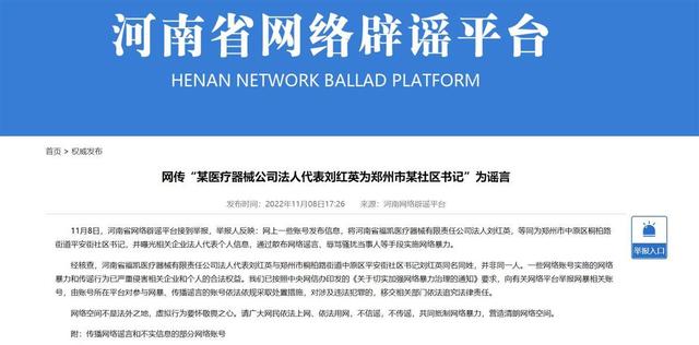 11月8日,河南省网络辟谣平台发布消息称,网上一些账号发布信息,将河南省福凯医疗器械有限责任公司法人刘红英,等同为郑州市中原区桐柏路街道平安街社区书记,并曝光相关企业法人代表个人信息,通过散布网络谣言、辱骂骚扰当事人等手段实施网络暴力。经核查,河南省福凯医疗器械有限责任公司法人代表刘红英与郑州市桐柏路街道中原区平安街社区书记刘红英同名同姓,并非同一人。