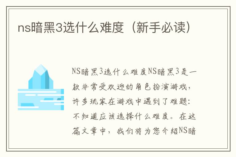 NS暗黑3选什么难度NS暗黑3是一款非常受欢迎的角色扮演游戏,许多玩家在游戏中遇到了难题:不知道应该选择什么难度。在这篇文章中,我们将为您介绍NS暗黑3的难度选择和相应的操作