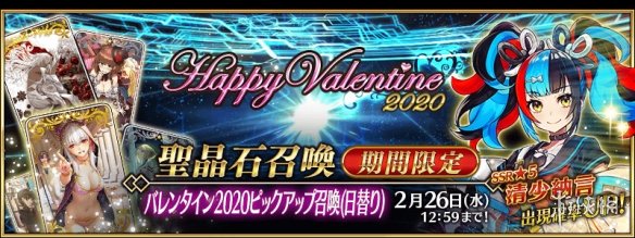 同时本次卡池将分成只有女性从者的「情人节2020pick up召唤1(日替)」和「情人节2020pick up召唤2(日替)」2种进行。两种卡池将对★5(SSR)女性从者进行日替pick up,「★5(SSR)清少纳言」进行常时pick up。