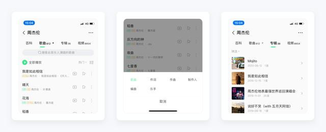 「歌曲」和「专辑」可按照热门、时间等类型进行筛选,也可以一键播放,非常方便,其次歌曲筛选还提供了一个非常冷门的功能,用户点击切换箭头后,可根据演唱、作词、作曲、制作人等进行筛选。